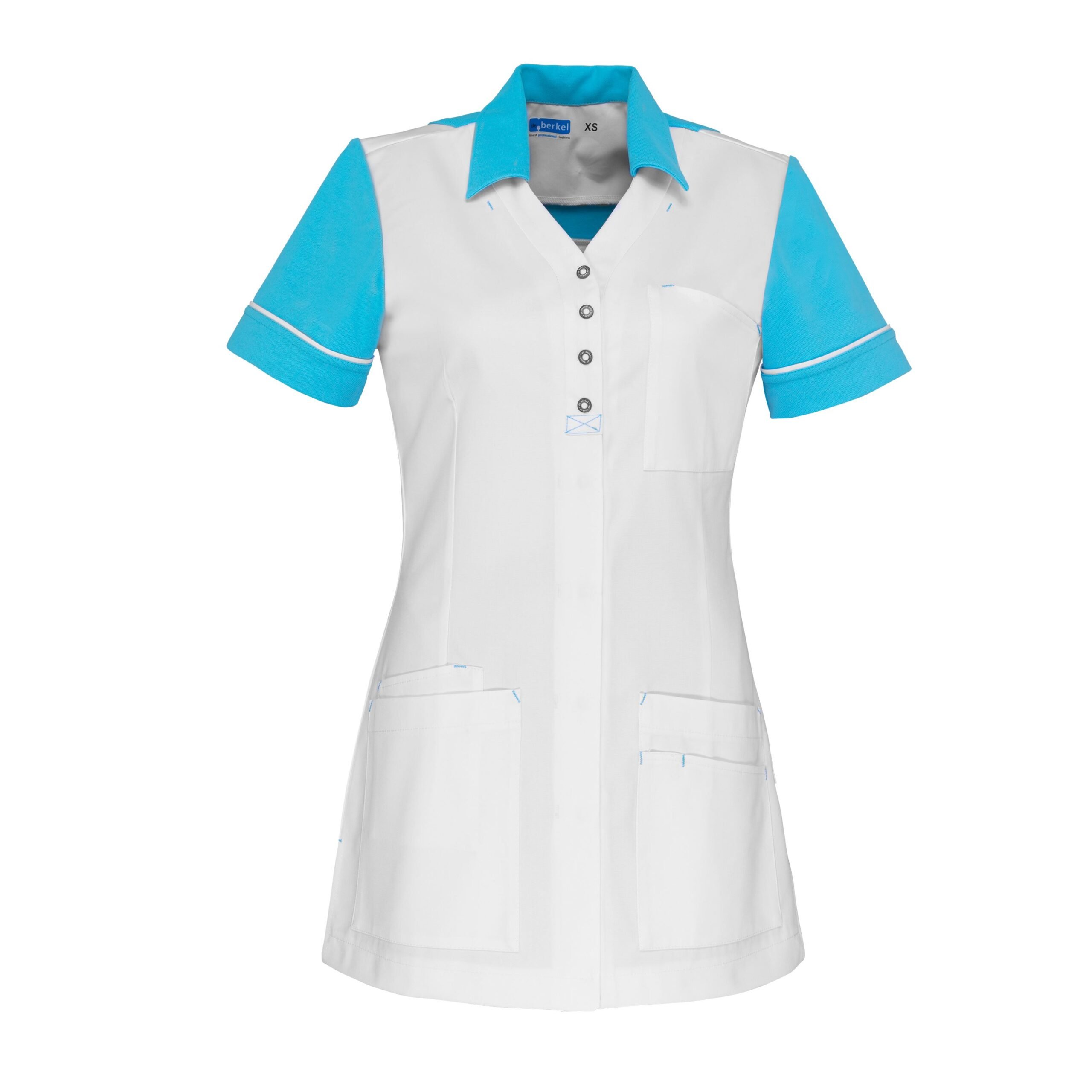 De Carmen dames zorgjas heeft een V-hals met kraag. De zorgjas heeft een halfblinde drukknoopsluiting, waarvan je de eerste vier knoopjes bovenin ziet zitten. De kraag, inzetstuk op de rug en de mouwen zijn voorzien van stretchstof (piqué). Ook biedt dit zorgjasje voldoende opbergmogelijkheden; een borstzak, twee zijzakken waarvan aan de rechterkant ook een telefoonzak en de linkerkant twee bovenelkaar gezette zakken. Voor extra bewegingsvrijheid heeft de jas zijsplitten. Het Carmen zorgjasje is verkrijgbaar in verschillende kleuren en effen wit. De kraag en mouwen van de jasjes hebben contrasterende kleuren. Ook verkrijgbaar in een unisex model (Camille). Samenstelling: 65% polyester / 35% kataoen. Beleg: 55% katoen / 45% polyester, Piqué.