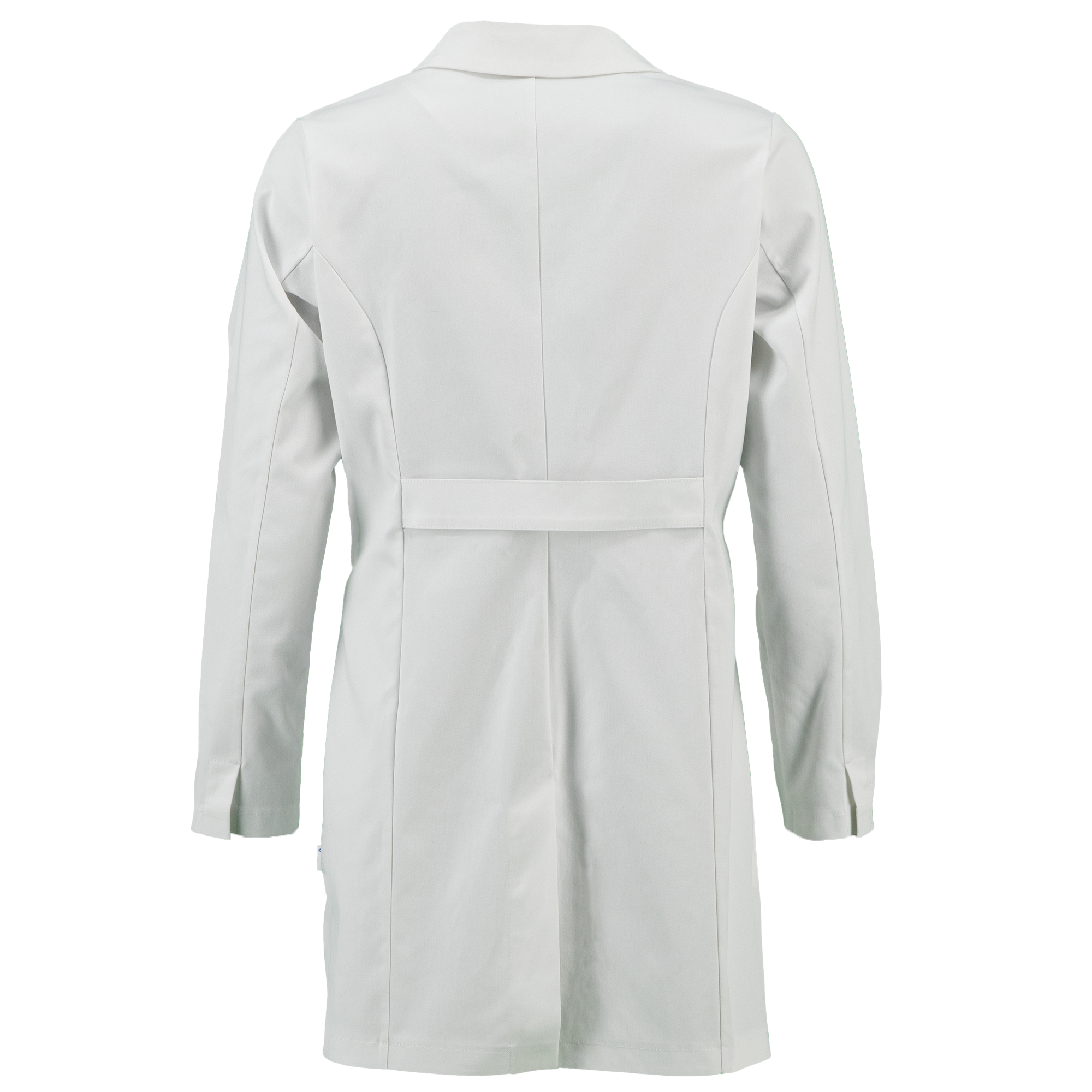 Stijlvolle damesdoktersjas met unieke stretch in Alsiflex. Het is een iets korter model : TL 85cm. De jas heeft een reverskraag met een sluiting middenvoor met knopen uit gerecycleerd polyester. Opgaande naden voor en achter, een rugband, passepoil borstzak en 2 ingestoken zijzakken met telefoonzakje. 79% gerecycleerde polyester / 21% katoen – 265gr/m² – SUPER STRETCH