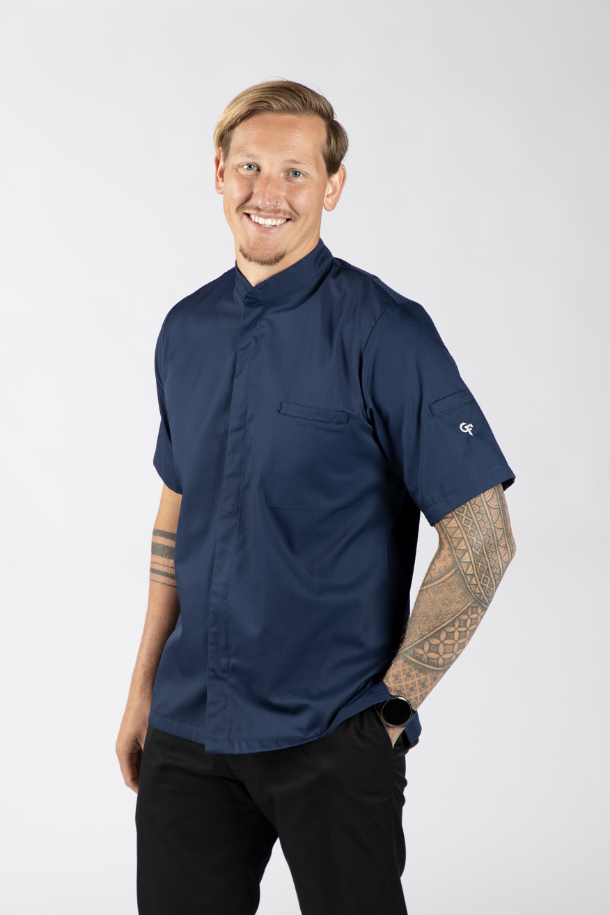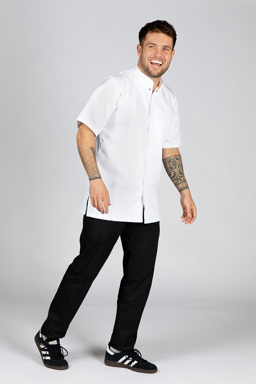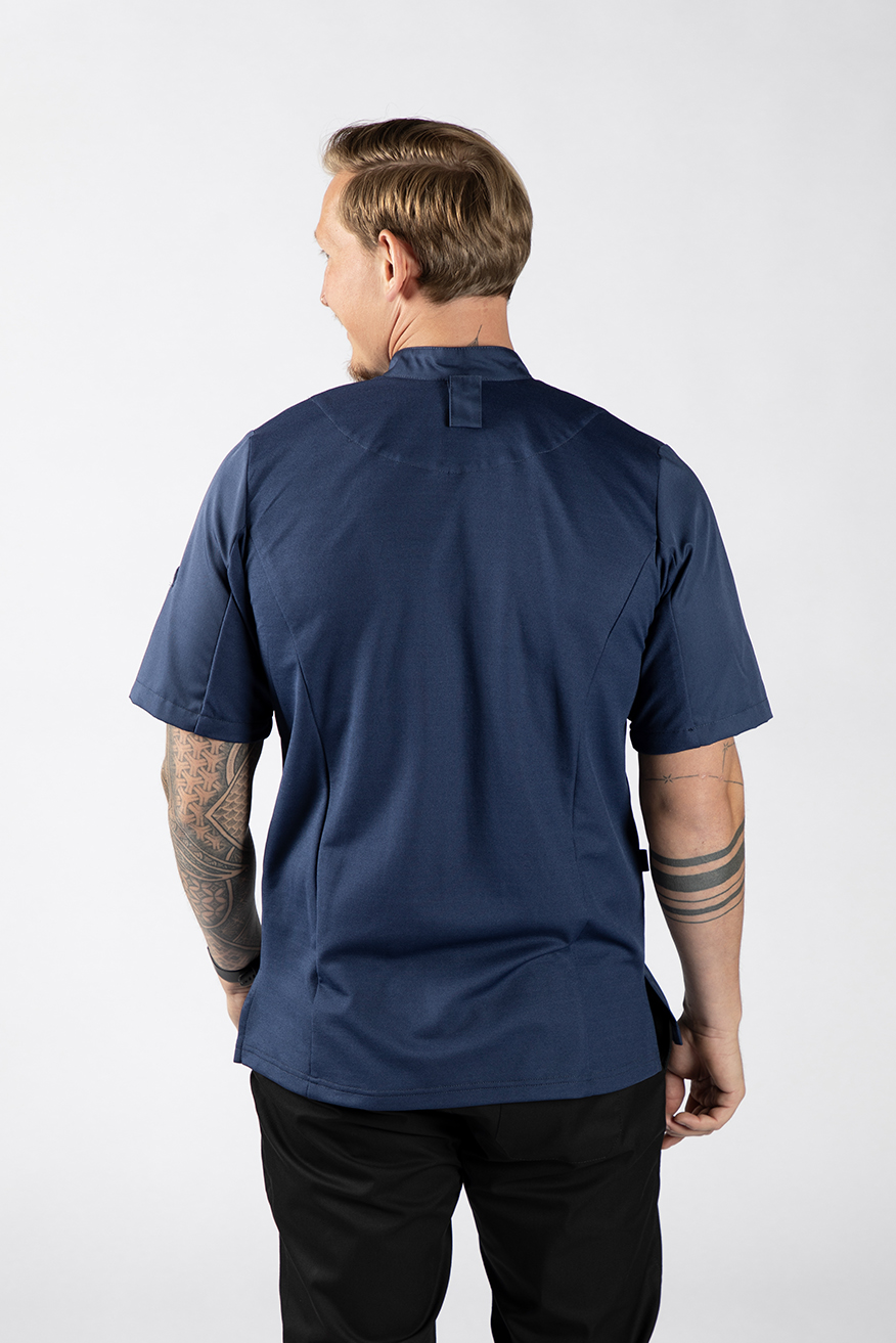 De Vin is een getailleerde moderne koksbuis van het merk Cheffix. Door de stretchstof op de rug ervaar je veel bewegingsvrijheid. Op de koksbuis zitten twee zakken, waar jij gemakkelijk al jouw keukengerei in kunt opbergen. Op de rug in de nek zit een schortenlus. Hiermee blijft het schort goed en netjes op z’n plek zitten.