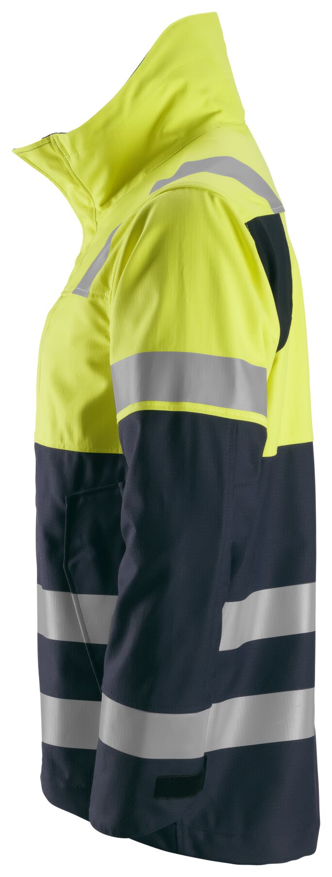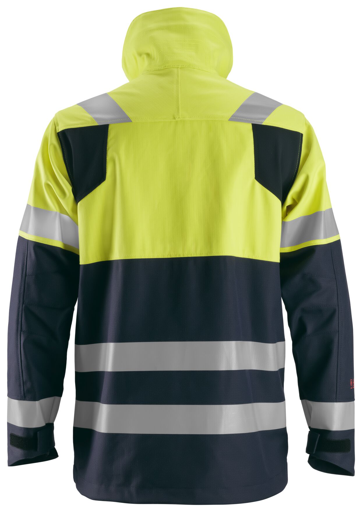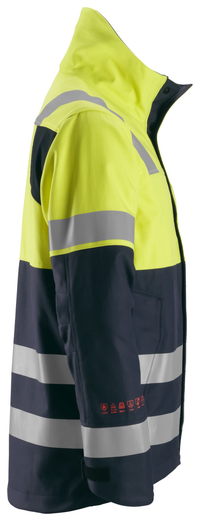 Beschermende jack die werkcomfort, hoge zichtbaarheid en bescherming biedt in risicovolle werkgebieden of gevaarlijke omgevingen. Het jack biedt gecertificeerde bescherming tegen elektrische vlambogen en lasprocessen. Extra veiligheid wordt geboden door intrinsieke bescherming tegen hitten en vuur en de antistatische eigenschappen. Voorgebogen mouwen met verlengde uiteinden en een verlengd rugpand zorgen voor extra comfort tijdens de werkzaamheden. Daarnaast biedt de vlamvertragende voering aan de voorkant, op de schouders en mouwen een hogere beschermingsgraad voor de meest blootgestelde lichaamsdelen. De ATPV-waarde voor mouwen en voorpand is 27,6 cal/cm2, Klasse 2 en HAF 89,9%. Het jack heeft ook een kortere voorkant voor gemakkelijk toegang tot gereedschap en spullen in de werkbroekzakken.