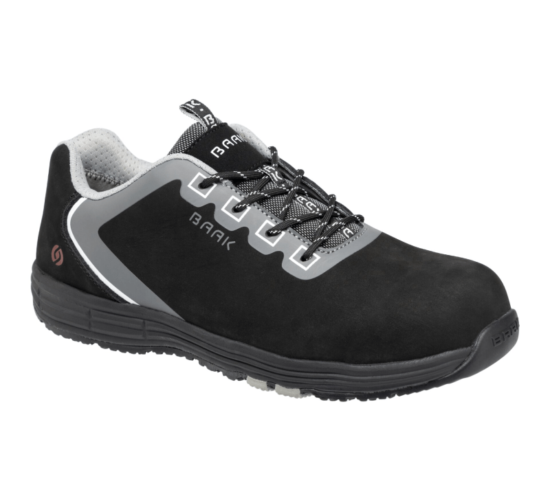 Bijzonder lichte, sportieve veiligheidsschoen met een comfortabele pasvorm; EN ISO 20345 S3 SRC ESD; 100% Metaalvrij; Bovenmateriaal hoogwaardig rundsnubuckleder; Klima-regulerende textiel-voering; Baak® go&relax-System voor voetverantwoord afwikkelen, bestaat uit Baak-Flex-neus & Baak-Flex-zone in bal van de loopzool; Zacht dempende Baak ESD Softstep+ inlegzool ademend en vochtregulerend; antibacterieel; EVA/Nitril loopzool; Demping over het gehele loopvlak; niet schrijvend; zeer hoge antislip waarde; Gecertificeerd voor orthopedische steunzoolen volgens Duitse norm DGUV Regel 112-191; Brede Composiet-Flex-veiligheidsneus voor veel teenruimte; Flexibele Kevlar tussenzool; Maat 36-40, Wijdte10; Maat 41-48, Wijdte12
