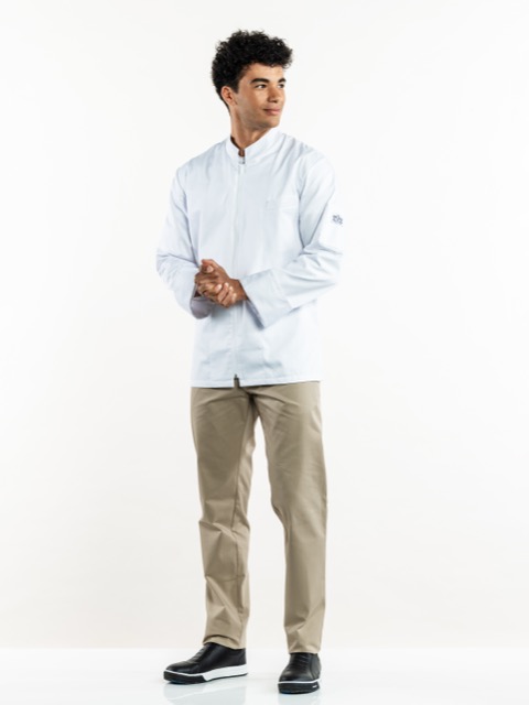 Deze regular-fit koksbroek heeft rechte pijpen en valt comfortable op de heup. Het is een vlot en modern model, afgewerkt met elastiek in de band op de rug. De pantalon heeft twee riemlussen aan de voorkant en drie aan de achterkant, heeft twee steekzakken en een kontzak. De koksbroek is een fijne neutrale broek, die goed te combineren is.