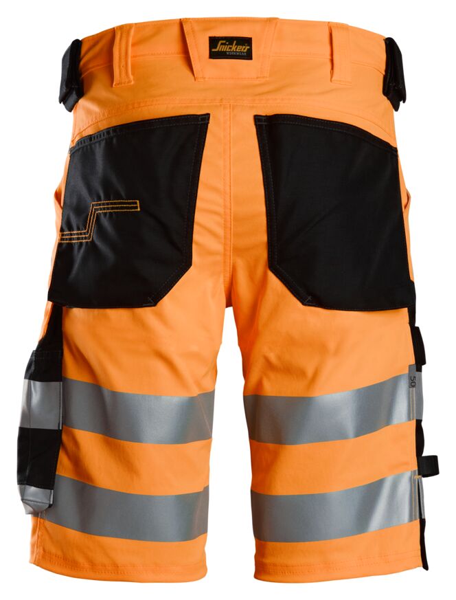 High-visibility klasse 1 korte werkbroek met holsterzakken en slim-fit, zeer geschikt voor professionals die werkzaam zijn in de algemene bouw, wegwerkzaamheden of transport.