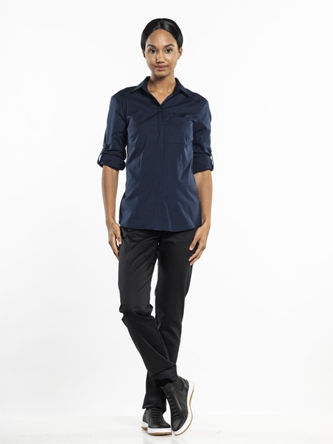 Deze blouse heeft een comfortable pasvorm en heeft een zachte en kreukherstellende stof. Door het stretch materiaal ervaar je veel bewegingsvrijheid en geeft de gladde, geweven stof een elegante uitstraling. De achterpanden en delen van de mouwen zijn gemaakt van jersey-stof. De blouse heeft een borstzakje, een blinde sluiting met knopen en een duurzaam karakter omdat het gemaakt is van gerecyclede plastic flessen. De blouse is er ook in een heren model en verkrijgbaar in verschillende kleuren.